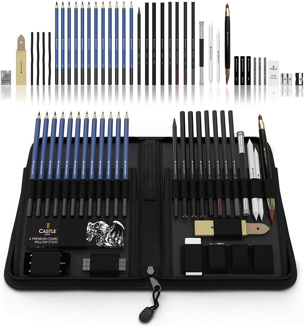 Castle Art Supplies Graphite Drawing Pencils and Sketch Set (40-Piece Kit), Complete Artist Kit Includes Charcoals, Pastels and Zippered Carry Case, Includes Rare Pop-Up Stand